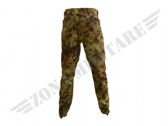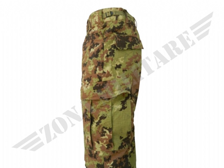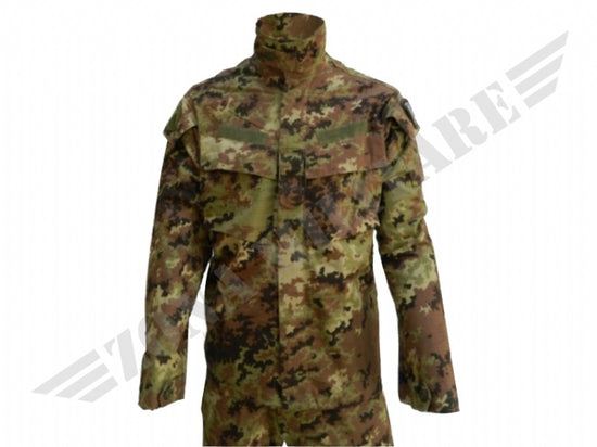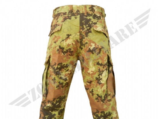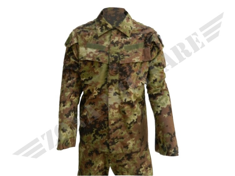 Completo mimetico vegetato ultima versione , giacca e pantaloni in puro cotone ripstop con tessitura in nylon in fibra, per prevenire e bloccare gli strappi sul nascere. La giacca ha il colletto con pattella a bottoni, le tasche pettorali, le tasche su braccio, il porta grado, rinforzo ai gomiti ed i velcri in disposizione per applicare le patch. I pantaloni hanno i passanti per cintura rinforzati, le tasche a taglio, le tasche con chiusura a bottoni sul retro, tasconi laterali, rinforzi alle ginocchia e caviglie e regolatore a vita esterno.