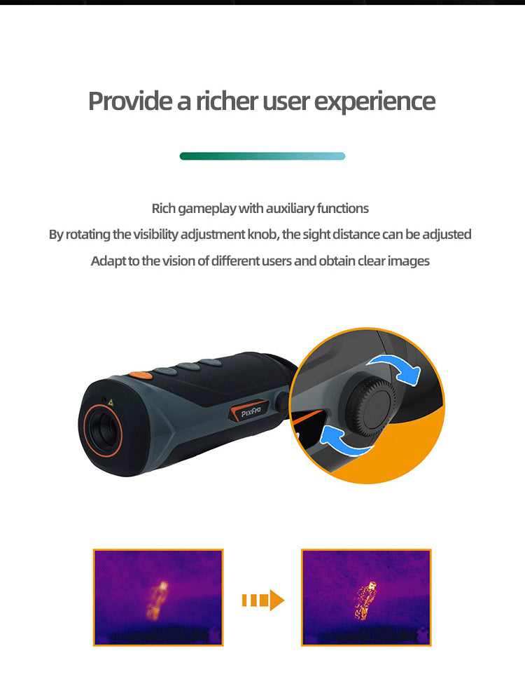 · Regolazione diottrica: utilizzando la rotella di regolazione diottrica, il monoculare può essere impostato per adattarsi alla vista di diversi utenti, assicurando che ogni utente veda un'immagine chiara.